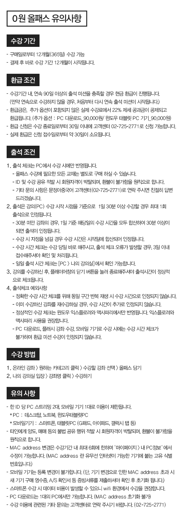[선택 정보] 서비스 이용(수강) 기록, 접속 로그, 쿠키, 디바이스 기기 등록 댓수, 방문 일시, 위치정보, 불량 이용 기록 정보 - 수강 이력 및 인구통계학적 틍성에 따른 광고 게재, 서비스 유효성, 접속 빈도 파악 및 회원의 서비스 이용에 대한 통계 등
